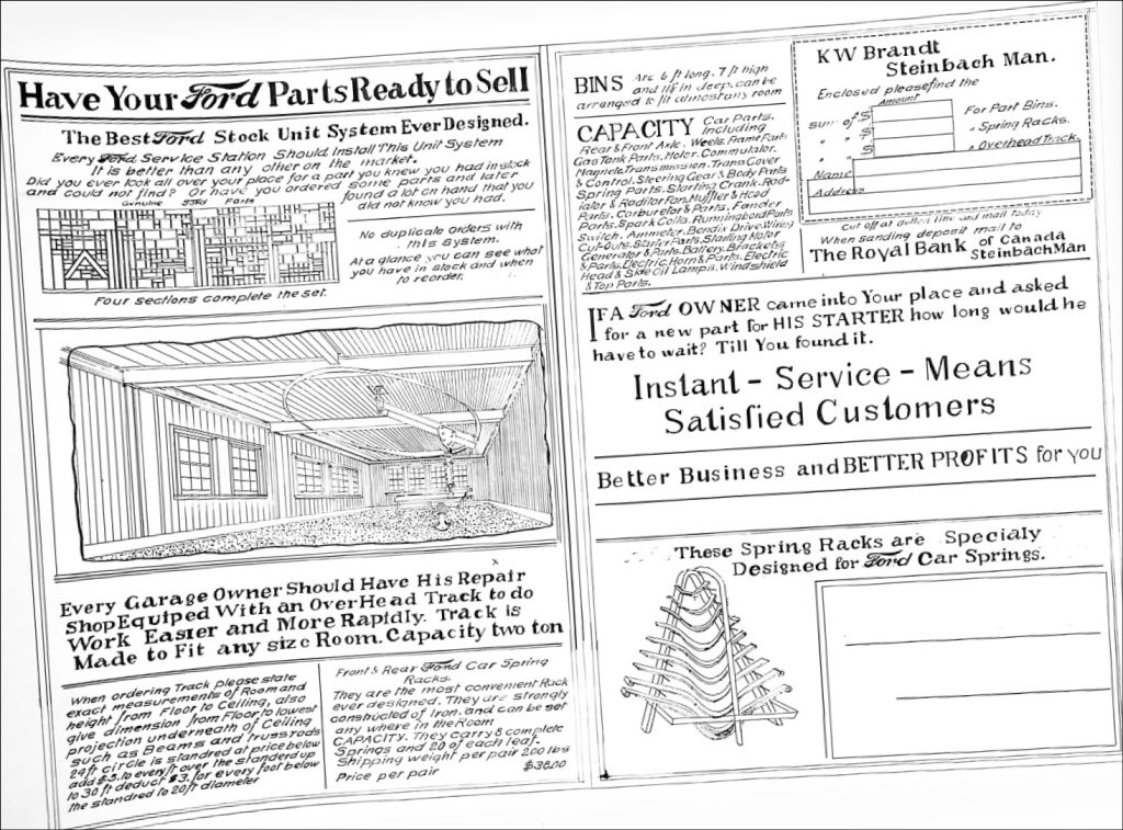 Given the close nature of the Brandt and Friesen families, likely Klaas’ inventory solution arose from dinnertime conversation. In 1914, J. R Friesen, Brandt’s brother-in-law, had opened the first Ford dealership in western Canada on the south side of Main St. near Friesen Ave. This was directly across the street from the Friesen Machine Shop. Both businesses are still in operation today as Fairway Ford and Friesen Machine Works, respectively.