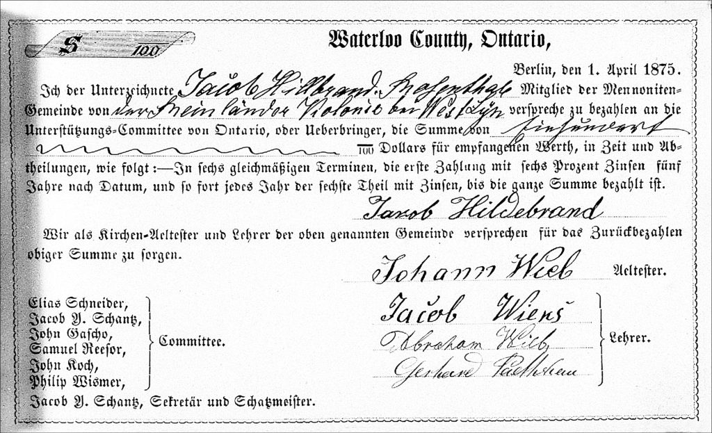 The government loan for the 1870s Mennonite immigrants’ travel and resettlement expenses, which was secured by bonds signed for by Ontario Mennonites, in addition to the direct loans of their own funds extended by the latter, has already been extensively covered by others.4 The West Reserve Gebietsamt records, fragmented as they may be, provide the Reinländer Gemeinde account of events. In 1875, the Mennonite immigrants destined for the West Reserve settled in eighteen villages and it seems apparent that the Waterloo Society had prepared for their arrival and anticipated their financial needs. The society had pre-printed promissory notes marked “Berlin”5 and dated April 1, 1875, with blanks left open for names, sums, and signatures. The individual’s name and village of settlement was subsequently added and that he was a member of the Mennonite “Gemeinde” of the Reinländer Colony at West Lynne. For value received, the individual promised to pay the society or bearer, a certain sum: in each case $100 was entered. It was repayable in 6 equal installments, the first payment with 6% interest due 5 years after the issue date, with payments continuing annually thereafter until it was fully paid. This promissory note was signed by the individual and then countersigned by Ältester (bishop) Johann Wiebe and three ministers, (Jacob Wiens, Abraham Wiebe, and Gerhard Paetkau), who promised to ensure the repayment.6 Some individuals signed several $100 notes.7 Heads of 145 families, all appearing to be 1875 arrivals, were recorded as owing $22,252 through these notes.8 However, at the end of 1875 this sum had only reached $21,852.9 This amount was recorded as part of the Gebietsamt corporate debt.10 Despite the first West Reserve settlers having only arrived in July 1875, the Gebietsamt noted that interest would be calculated thereon from the 1st of April,11 the date on the preprinted promissory notes. Other such promissory notes for the 1876 immigrant arrivals likely existed but the Gebietsamt did not designate a further corresponding sum specifically owing to the Waterloo Society as they initially did for the 1875 arrivals.