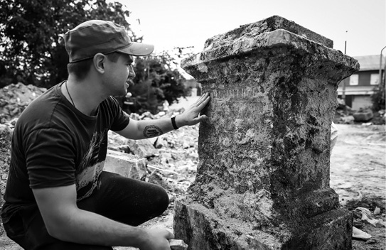 On the morning of July 22, 2019, Max, historian Roman Akbash, and Mykola Anatoliyovych Svydran, a colleague from the KNR, started the excavation of the building’s foundation. It was a hot and humid day, and they used only picks and shovels. It wasn’t long before the excavation led to the discovery of many gravestones belonging to the Chortitza Mennonites.