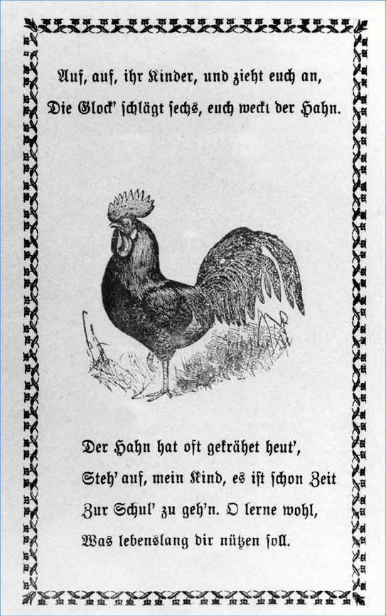 In passing, I want to describe the school as it was furnished at that time: The building, small and low, was held together with clay. In the classroom there was no furniture other than two benches along the length of the room and between them a table two feet wide and a chair for the teacher. The boys sat on one bench and the girls on the other side; the teacher sat at the end of the table. Under the table, the pupils of both sexes would get up to a lot of mischief, especially when the teacher’s eyes were closed. The latter, often a Low German, did not teach and was not allowed to teach the children any other pronunciation of the letters than the Low German way, e.g., instead of a, h, k one said oa, hoa, koa, etc. The teacher did not know anything about orthography, which was not held against him, because it was generally believed that this would instill pride in the children, and so on. I attended such a school for six winters; in the mornings and evenings, when I came home from school, I had to feed the cattle and clean the stable. In spring the holidays started, i.e., when one began to plow, and they ended only around St. Martin’s Day. Compare the schools of that time with the schools of today, and I will not be reproached for my style, as I never enjoyed any other lessons than those in that village school.