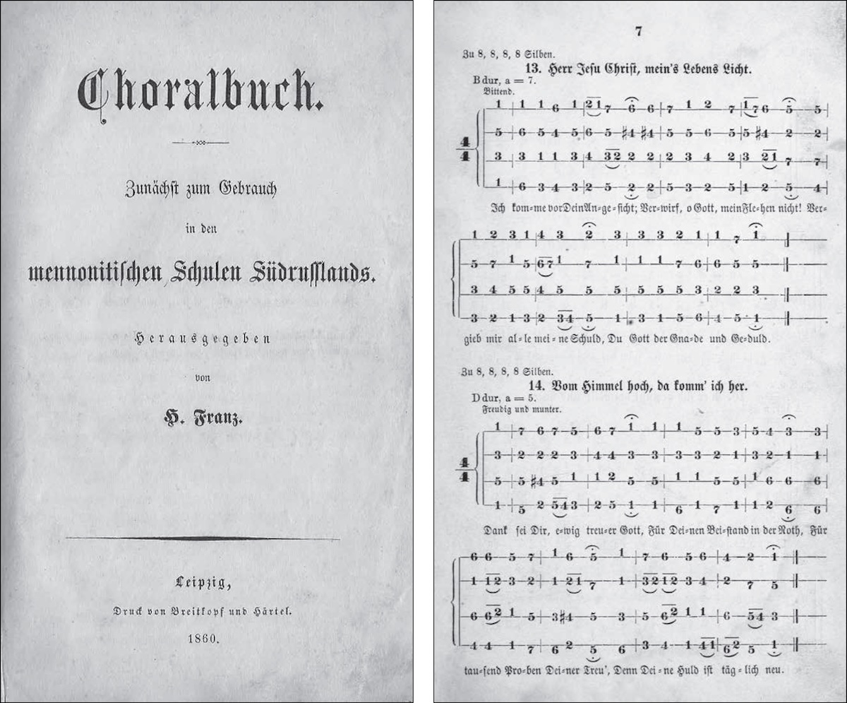 The publication of Franz’s Choralbuch in 1860 aided in the standardization of singing within Mennonite communities. For years, teachers and pupils copied the chorale melodies notated by Franz in numerals. However, Franz and other leading figures recognized that “the frequent copying of this chorale book by pupils would gradually distort the melodies again . . . so it [was] recognized as necessary to reproduce the chorale book in print and then to introduce it into the schools for singing lessons.”17 In 1852, Franz was commissioned by Baron von Rosen, chairman of the Guardianship Committee for Foreign Settlers, to print his chorale book.18